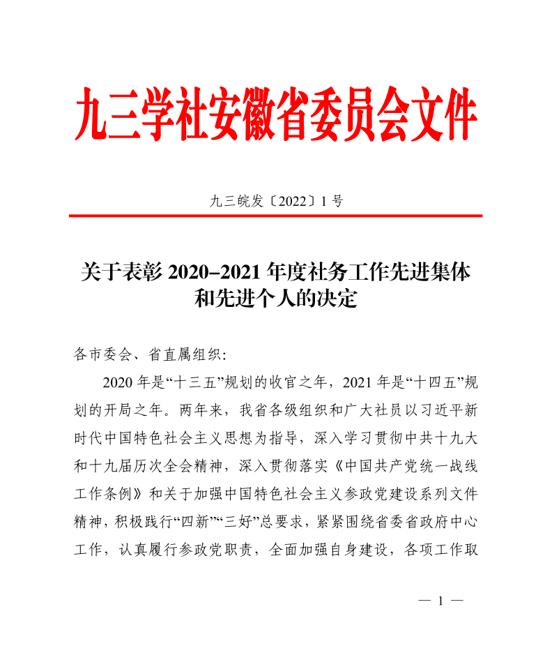 2020年是“十三五”规划收官之年,2021年是“十四五”规划开局之年,为树立榜样,进一步激励各级组织和广大社员在新形势下再创佳绩,1月6日,九三学社安徽省委员会表彰了社务工作先进集体和先进个人,九三学社宣州区支社荣获2020-2021年度先进基层组织表彰。两年来,九三学社宣州区支社在九三学社宣城市基层委员会的坚强领导下和宣州区委统战部的大力支持下,大力弘扬爱国、民主、科学的优良传统,认真学习习近平新时代中国特色社会主义思想,积极履行参政党职责建言献策,同时,发挥支社人才资源优势,开展各项社会服务,取得显著成绩,接下来,支社一定再接再厉,锐意进取,积极作为,以更加饱满的激情、更加扎实的工作、更加务实的态度,积极推进各项工作迈上新台阶。(张婷)