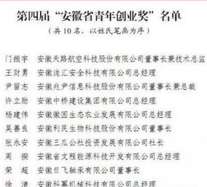 日前,由省委宣传部、团省委、省发改委、省教育厅、省科技厅、省经信委、省财政厅、省人社厅等单位联合举办的第四届“安徽省青年创业奖”评选活动结果揭晓,共评选出“安徽省青年创业奖”10名,区政协委员、安徽省文程能源科技有限公司总经理周揆荣誉入选。希望政协委员们以此为榜样、标兵,在我区经济发展以及参政议政的舞台上能发挥更大的潜力和作用。