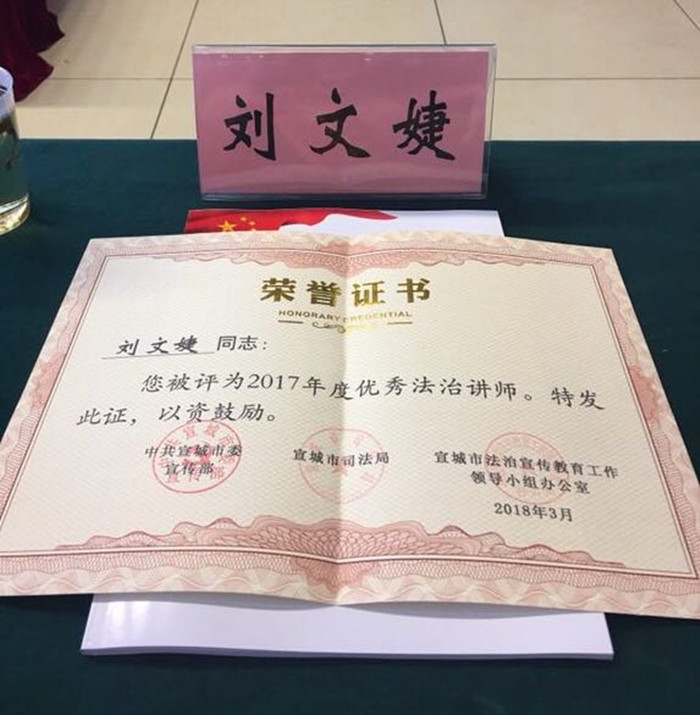 区政协委员刘文婕被中共宣城市委、宣城市司法局、宣城市法治宣传教育工作领导小组办公室三部门综合评为“2017年度优秀法治讲师”,表彰其在过去的一年里为政府机构、事业单位、企业、教育机构、社区、乡镇、妇联组织、戒毒机构等多部门的相关人员讲解、传播法律知识,发挥了委员以专业知识服务社会的作用,在平凡的岗位上“接地气、敢担当、有作为”,践行了一名政协委员的初心和责任。