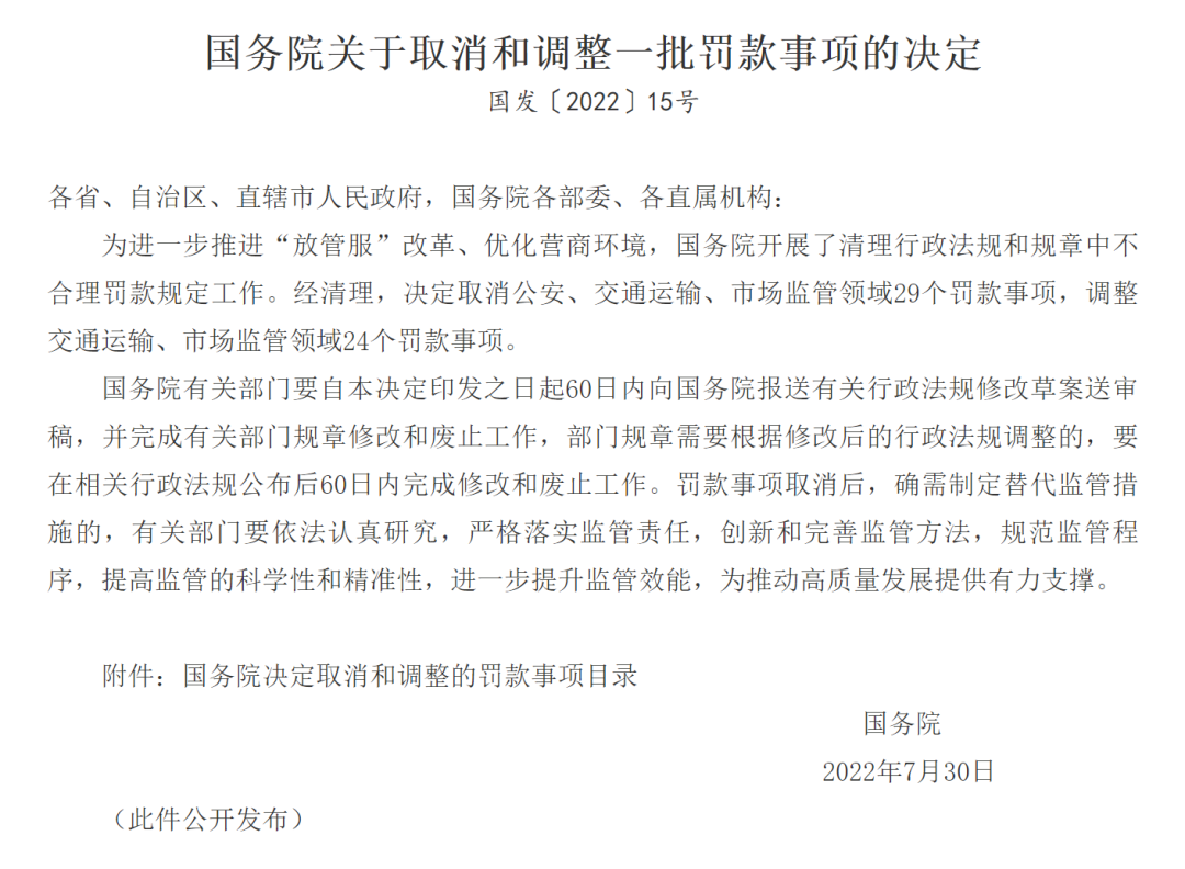 为进一步推进“放管服”改革、优化营商环境,国务院日前印发《关于取消和调整一批罚款事项的决定》(以下简称《决定》),取消和调整了公安、交通运输、市场监管领域行政法规和部门规章设定的53个罚款事项,其中,取消29个罚款事项,调整24个罚款事项。