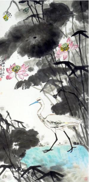 姚成林《荷花鹭鸟》国画