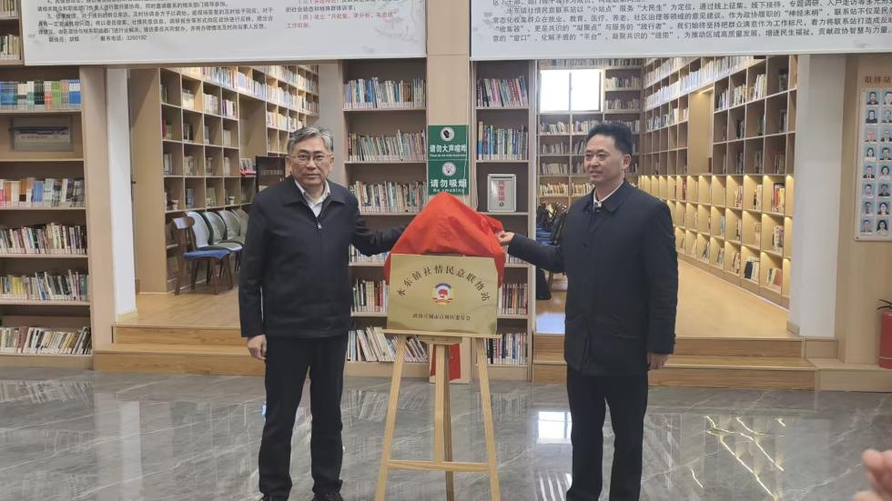 11月26日上午,水东镇社情民意联络站揭牌仪式在水东镇家城图书馆举行。区政协党组书记、主席时国金揭牌并讲话,区政协党组副书记、副主席汪征跃,秘书长张玲,水东镇党委书记陈章学出席揭牌仪式。